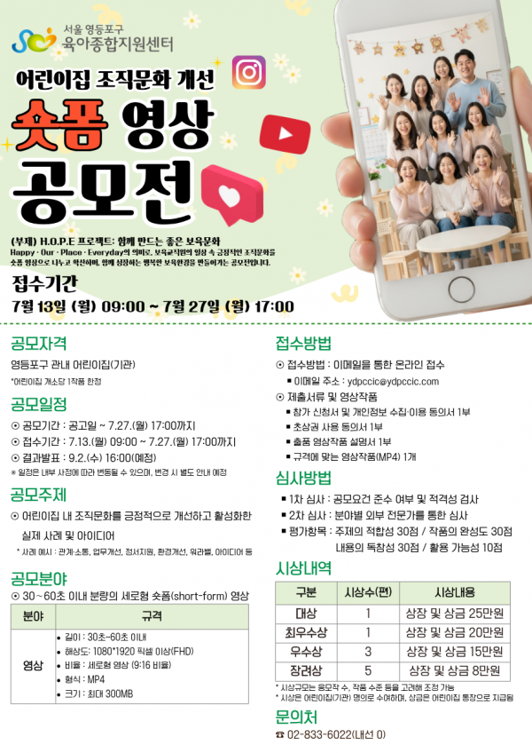 영등포구육아종합지원센터, 「어린이집 조직문화 개선 숏폼 영상 공모전」 개최