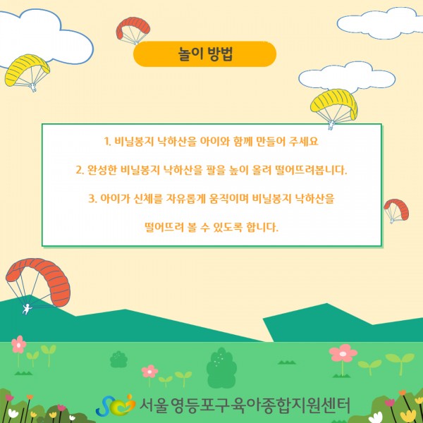 비닐봉지 낙하산 놀이 페이지 정보 작성자 영등포구육아종합지원센터 작성일22-09-13 09:54 조회785회 댓글0건 관련링크 이전글 다음글 목록 본문 아이와 비닐봉지 낙하산을 만들어 즐겁게 놀이해 보아요. 댓글목록 등록된 댓글이 없습니다. 이전글 다음글 목록