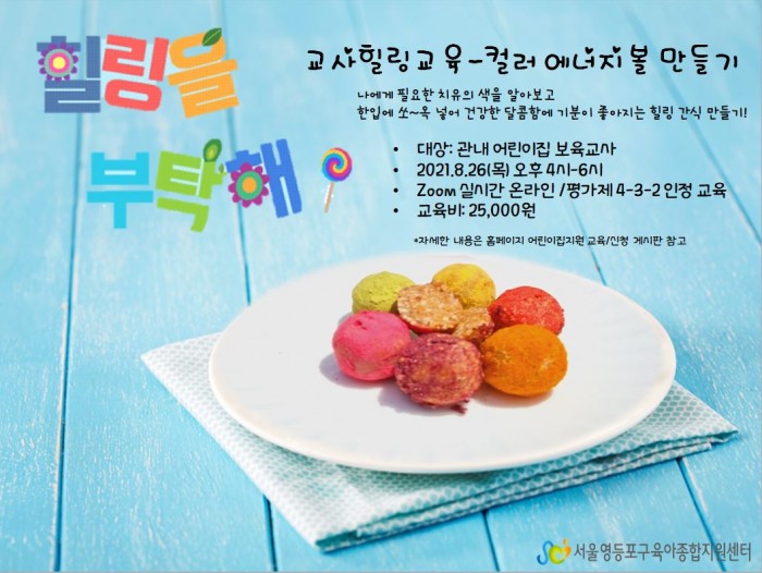 | 장소 | 실시간 온라인 교육 | 만족도조사 | 8/26 교사힐링교육-컬러에너지볼 만들기 |