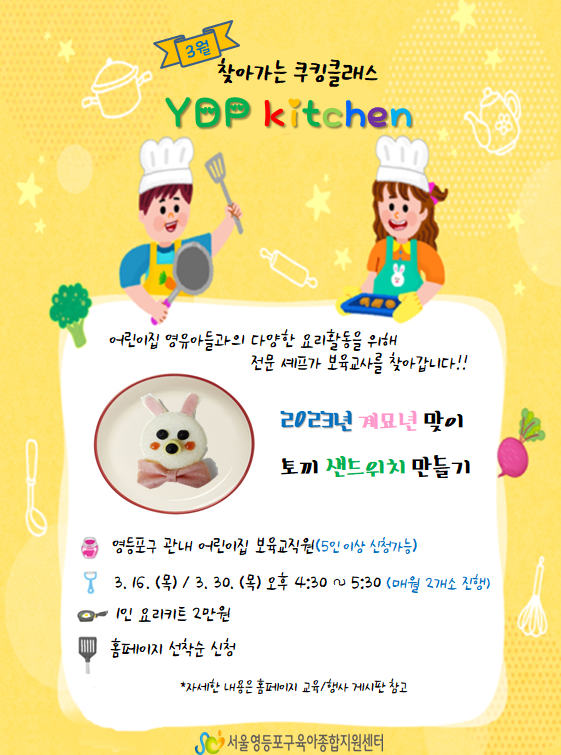 3월 16일(목) 16:30-17:30 | -‘23년 계묘년 맞이 토끼 샌드위치 만들기 | 김혜정 (아이뷰) | 신청 어린이집 | 최세나 |