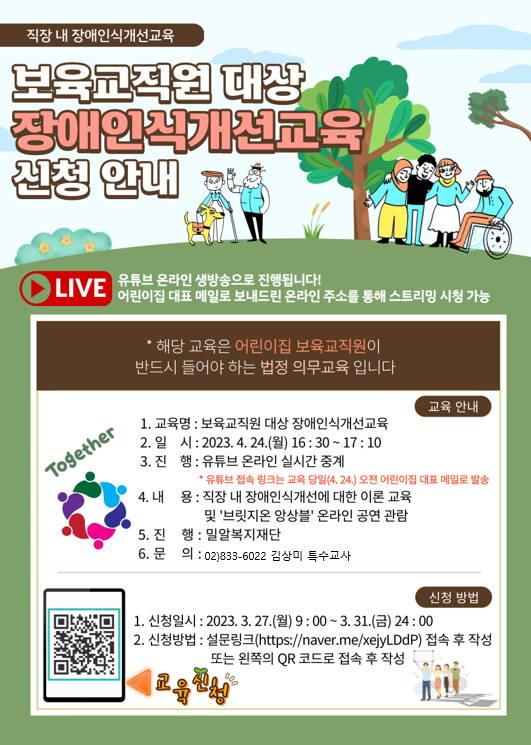 기타안내 | -신청기간: 3월 27일(월) ~ 3월 31일(금) -신청방법: 네이버폼, 홍보포스트 참고 부탁드립니다. -수료증은 밀알복지재단에서 신청자 및 교육참여자에 한해 확인됨을 알려 드립니다. -센터에서 수료증 확인은 불가함을 알려드립니다. | |||