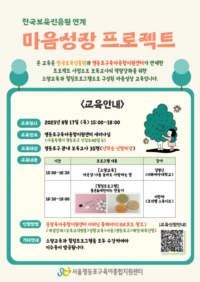 - 본 교육은 한국보육진흥원과 영등포구육아종합지원센터가 연계한 프로젝트 사업으로 보육교직원 역량강화를 위한 소양교육과 힐링프로그램으로 구성됩니다.
