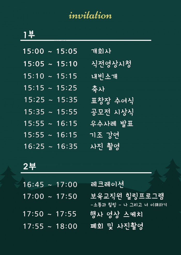 11월 17일(금) 15:00-18:00 | <1부> -개회사 / 식전영상 시청 / 축사 -표창장 수여 및 공모전 시상식 -우수사례 발표 / 기조강연