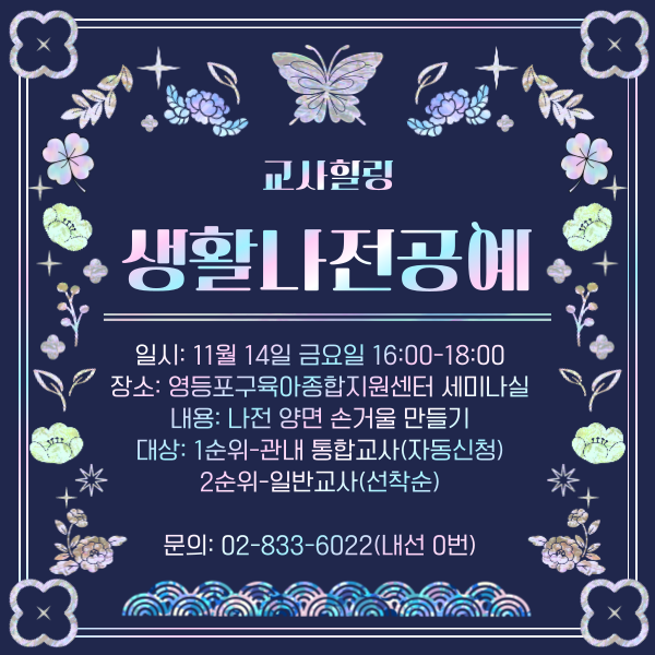 <안내사항> • 해당 교육은 재료비를 센터에서 지원하므로 사전 연락 없이 불참하실 경우, 추후 힐링교육 신청이 제한될 수 있습니다. • 부득이한 사정으로 불참 시 11월 7일(금)까지 센터로 연락주시기 바랍니다. | ||||