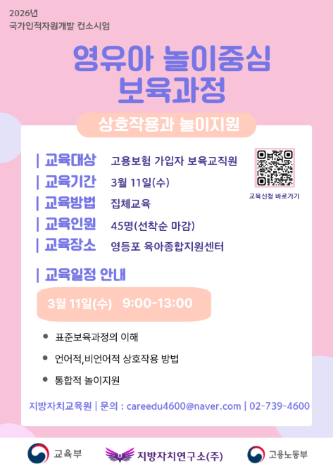 3월 11일(수) 9:00~13:00 | 놀이중심교육에서 교사의 핵심역할 발달단계별 놀이와 맞춤 지원 놀이상황별 상호작용의 실질적 접근 몰입도 높은 놀이 환경 설계하기 교사와 부모가 함께하는 놀이 연계 및 소통 | 지방자치교육원 전문강사 | 영등포구 육아종합 지원센터 세미나실 | 노주영 |