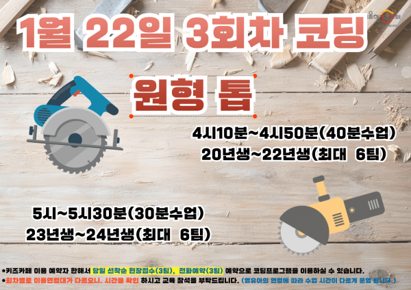 1.22 (목) | 16:10-16:50 *20년생~22년생 *최대6팀 | [원형 톱] 나만의 원형 톱을 만들어 보고 코딩카드를 이용해 원형 톱을 직접 움직여 본다.