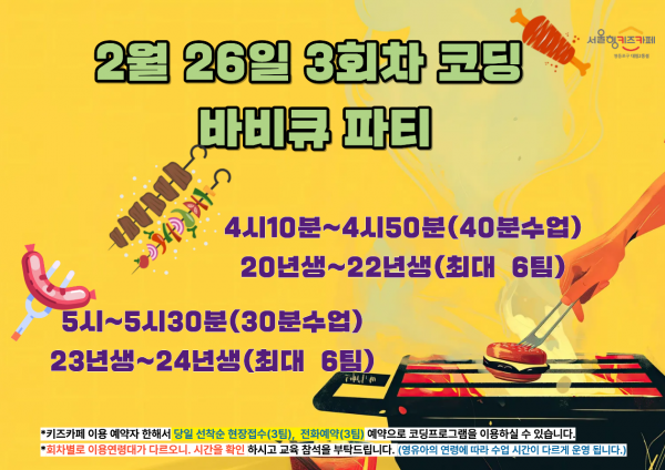 -2월 26일(목) 3회차를 키움포털에서 예약하신 후, 코딩 프로그램은 키즈카페 이용예약자에 한해서 당일 선착순 현장접수와 전화예약으로 신청이 가능합니다.