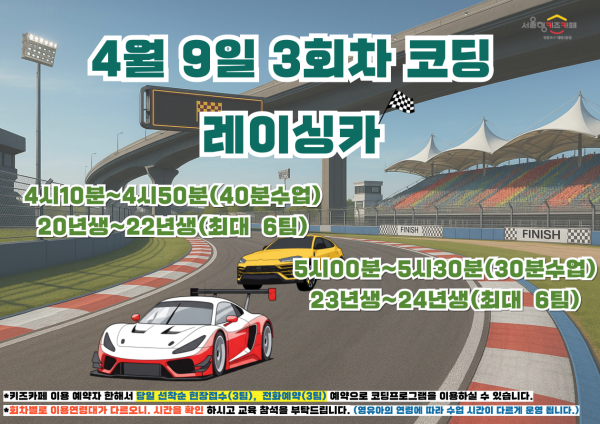 -4월 9일(목) 3회차를 키움포털에서 예약하신 후, 코딩 프로그램은 키즈카페 이용예약자에 한해서 당일 선착순 현장접수와 전화예약으로 신청이 가능합니다.