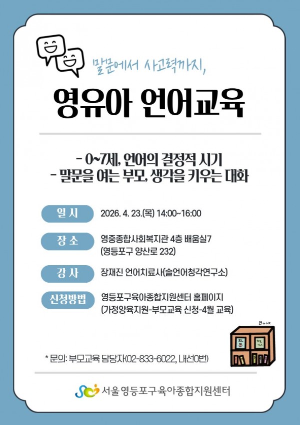 4월 23일(목) 14:00~16:00 | 【말문에서 사고력까지, 영유아 언어교육】 - 0~7세, 언어의 결정적 시기 말문을 여는 부모, 생각을 키우는 대화 | 장재진 (솔언어청각연구소) | 영중종합 사회복지관 4층 배움실7 | 진익현 |