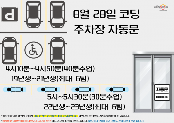 -8월28일(목) 3회차를 키움포털에서 예약하신 후, 코딩 프로그램은 키즈카페 이용예약자에 한해서 당일 선착순 현장접수와 전화예약으로 신청이 가능합니다.