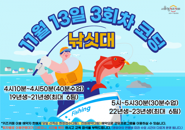 -11월13일(목) 3회차를 키움포털에서 예약하신 후, 코딩 프로그램은 키즈카페 이용예약자에 한해서 당일 선착순 현장접수와 전화예약으로 신청이 가능합니다.