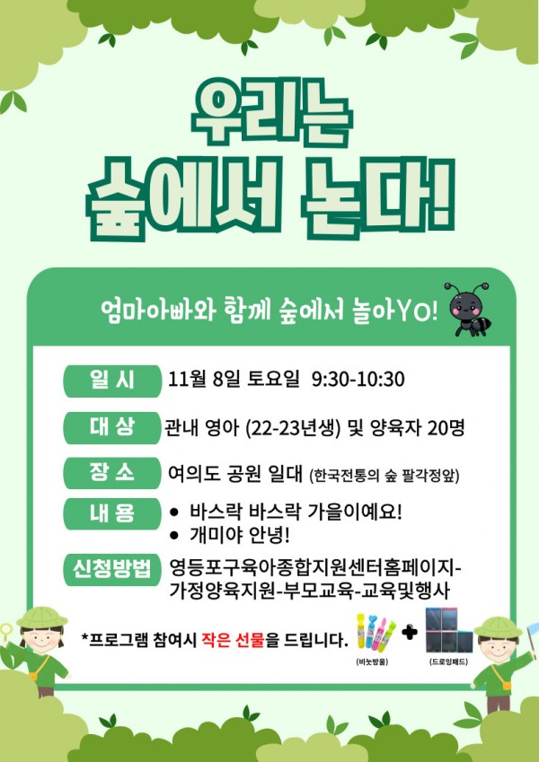 11월 8일(토) 9:30-10:30 | [바스락바스락 가을이예요] -물든 나뭇잎을 탐색하고 바늘꽂이에 꽂아 낙옆 날려보기 [개미야 안녕!] -개미를 찾아보고 개미의 움직임을 관찰하기 -개미 머리띠를 하고 부모님과 함께 개미 페르몬 놀이해보기 | 공미화,이현숙,정윤화,엄용수 (로빈숲) | 여의도공원 (한국전통의 숲 팔각정앞) | 한아랑 전담인력 |