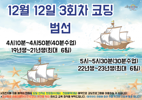 -12월 12일(금) 3회차를 키움포털에서 예약하신 후, 코딩 프로그램은 키즈카페 이용예약자에 한해서 당일 선착순 현장접수와 전화예약으로 신청이 가능합니다.