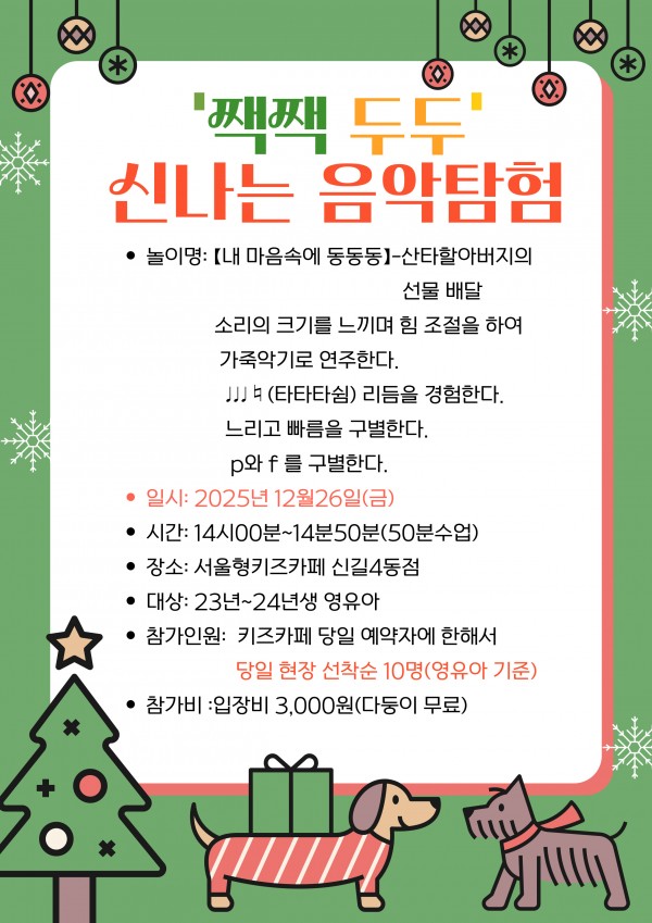 12월 26일(금) 14:00~14:50 *영유아 및 보호자 | 【내 마음속에 동동동】-산타할아버지의 선물배달 1) 소리의 크기를 느끼며 힘 조절을 하여 가죽악기로 연주한다. 2) ♩♩♩♮(타타타쉼) 리듬을 경험한다. 3) 느리고 빠름을 구별한다. 4) p와 f 를 구별한다.