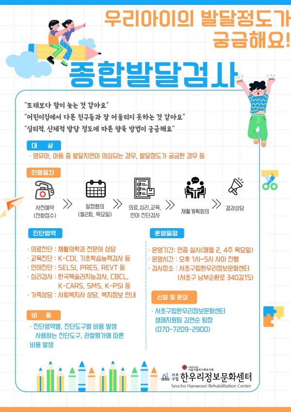 본 기관에서는 영유아 및 아동의 발달지연이 의심되거나 현재의 발달상태가 궁금하신 보호자, 유관기관 종사자를 대상으로 종합발달검사를 안내드리고 있습니다.