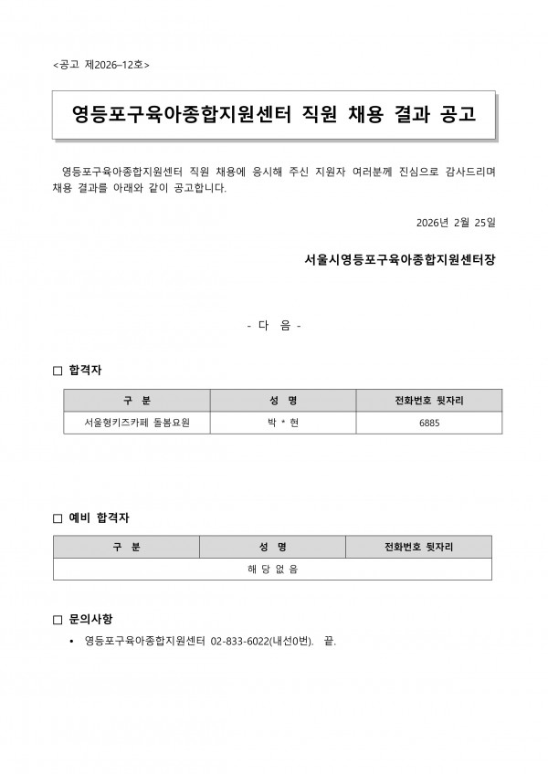 [채용결과]서울형키즈카페 직원 채용 결과 공고