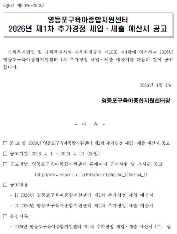 [공고2026-29] 2026년 영등포구육아종합지원센터 제1차 추가경정 세입세출 예산 공고.jpg