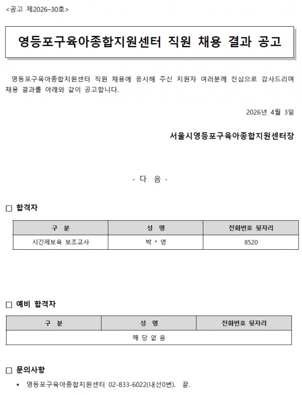 [공고2026-30]시간제보육 보조교사 채용 결과 공고