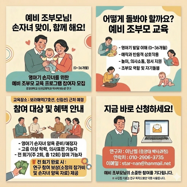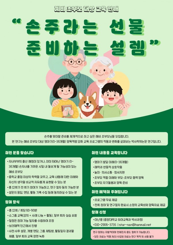 중앙대학교 일반대학원 유아교육학과에서 현재 자녀부부가 임신 중으로 손주를 만날 예정이거나 0~36개월 손자녀를 곧 돌보게 될 조부모님을 대상(* 또는 손자녀를 돌보기 시작한 지 1~2개월 되신 분)으로 무료 교육 프로그램 참여자를 모집하고 있습니다.