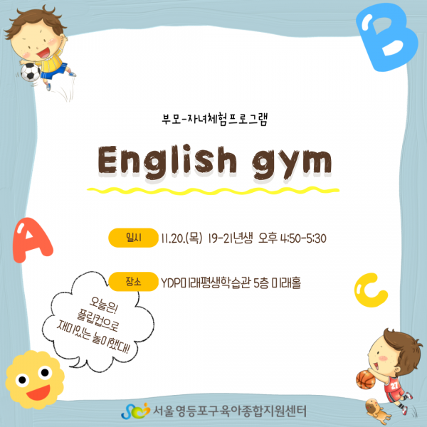 교육 | 부모-자녀체험프로그램 '영어체육' 페이지 정보 작성자 영등포구육아종합지원센터 작성일25-11-21 10:28 조회36회 댓글0건 관련링크 이전글 다음글 검색 목록 본문 11.20(목) 관내 유아(19-21년생) 대상으로 영어체육을 진행하였습니다. 올해 영어체육 프로그램은 마무리가 되었으며 26년에 다시 진행할 예정입니다. 댓글목록 등록된 댓글이 없습니다. 이전글 다음글 검색 목록