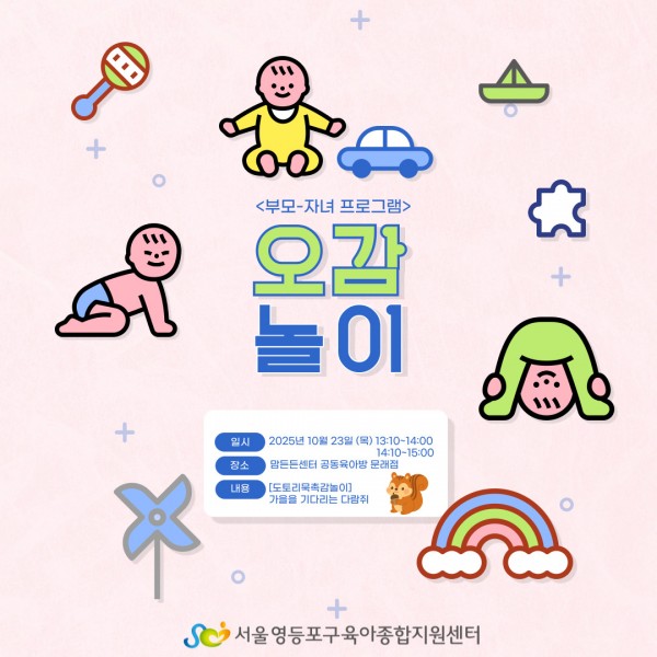 교육 | [부모-자녀체험프로그램] 오감놀이-옹알종알 페이지 정보 작성자 영등포구육아종합지원센터 작성일25-10-28 11:44 조회72회 댓글0건 관련링크 이전글 다음글 목록 본문 10.23(목) 공동육아방 문래점에서 오감놀이'옹알종알' 프로그램을 진행하였습니다. 오감놀이 프로그램 다음 일정은 11.27.(목) 공동육아방 문래점 에서 진행될 예정이오니 많은 참여 부탁드립니다! 댓글목록 등록된 댓글이 없습니다. 이전글 다음글 목록