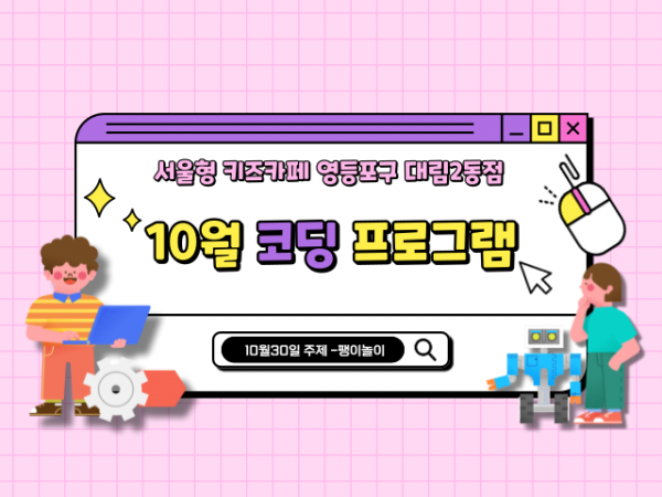 놀이터 | [서울형 키즈카페 영등포구 대림2동점] 10월 코딩프로그램 페이지 정보 작성자 영등포구육아종합지원센터 작성일25-10-30 18:33 조회80회 댓글0건 관련링크 이전글 다음글 목록 본문 10월 30일 (목) 서울형 키즈카페 영등포구 대림2동점에서[변신 로봇 메이큐와 흥미진진한 코딩의 세계로!-'팽이놀이'] 코딩 프로그램이 진행 되었습니다. 댓글목록 등록된 댓글이 없습니다. 이전글 다음글 목록