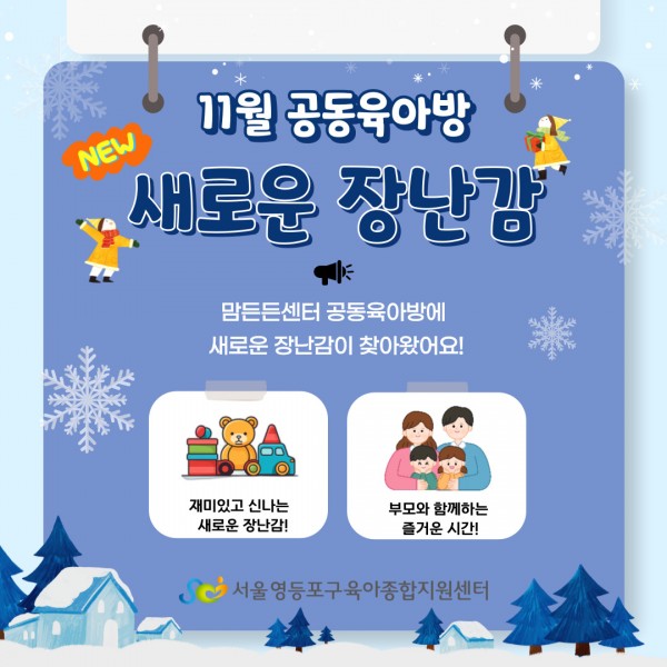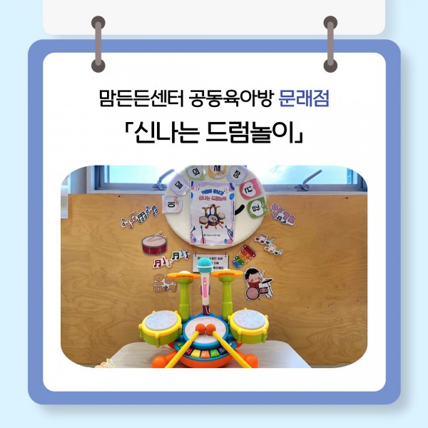 놀이터 | 맘든든센터 공동육아방 11월 새로운 장난감 페이지 정보 작성자 영등포구육아종합지원센터 작성일25-11-01 17:02 조회90회 댓글0건 관련링크 이전글 다음글 목록 본문 맘든든센터 공동육아방 11월 새로운 장난감 댓글목록 등록된 댓글이 없습니다. 이전글 다음글 목록