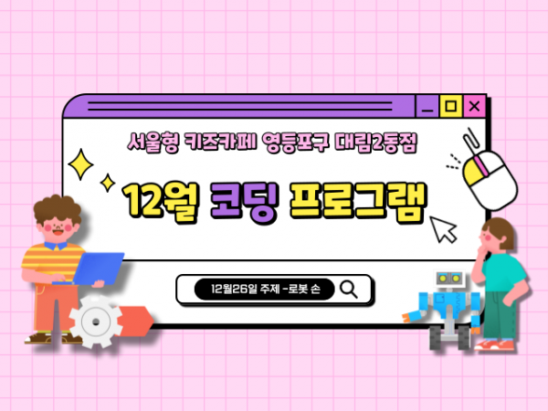 놀이터 | [서울형 키즈카페 영등포구 대림2동점] 12월 코딩프로그램] 페이지 정보 작성자 영등포구육아종합지원센터 작성일25-12-26 17:34 조회157회 댓글0건 관련링크 이전글 다음글 목록 본문 12월 12일 (금) 서울형 키즈카페 영등포구 대림2동점에서[변신 로봇 메이큐와 흥미진진한 코딩의 세계로!-'로봇 손'] 코딩 프로그램이 진행 되었습니다. 댓글목록 등록된 댓글이 없습니다. 이전글 다음글 목록