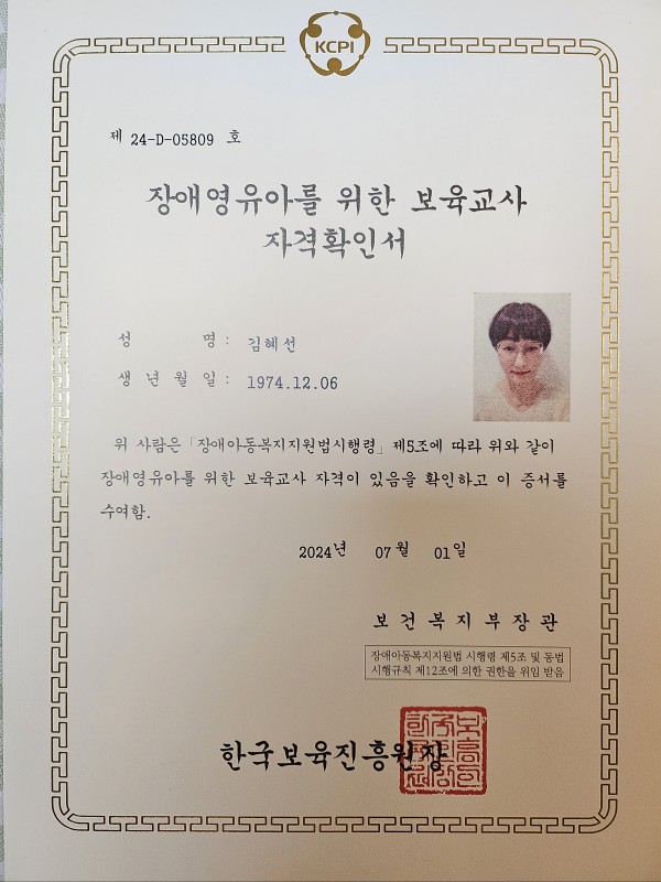 | 보유자격 | 유치원정교사2급, 보육교사1급, 장애영유아를 위한 보육교사 | ||||
